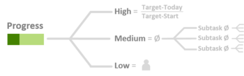 The progress of a task indicates how much work has been done as a percentage. The system automatically estimates progress depending on the task type. The level of progress of high-level tasks is estimated based on the start date, today's date and the target date. For medium-level tasks, the progress is estimated by aggregating the progress of their subtasks as an average. The progress of low-level task is always set by the user.